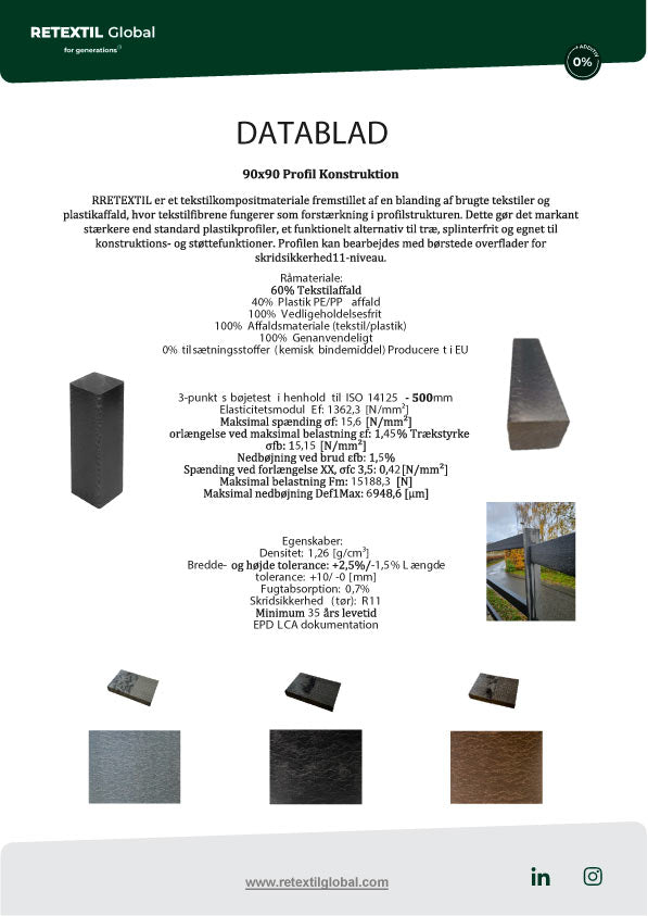 RETEXTIL stolper er lavet af 40% plastfolie og 60% tekstilaffald uden additiver, og de har både plast og træ's bedste egenskaber. De er lette at forarbejde som træspidspæle, modstandsdygtige over for fugt og vand, og stærkere end almindelige kompositmaterialer. Der er ingen behov for imprægnering, maling, eller løbende vedligeholdelse, og de kan endda renses under højt tryk uden kemikalier. Disse spidspæle er velegnede til brug i jorden, vandet, haven, på terrasser og som terrassepæle og hegnspæle. Husk at forbore, før du skruer dem fast